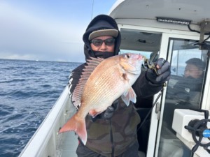 予報よりも風強めで海悪く釣りしずらい状況でしたが中盤から2名様で頑張っていただきポイント転々として何とか型だしていただきました😆